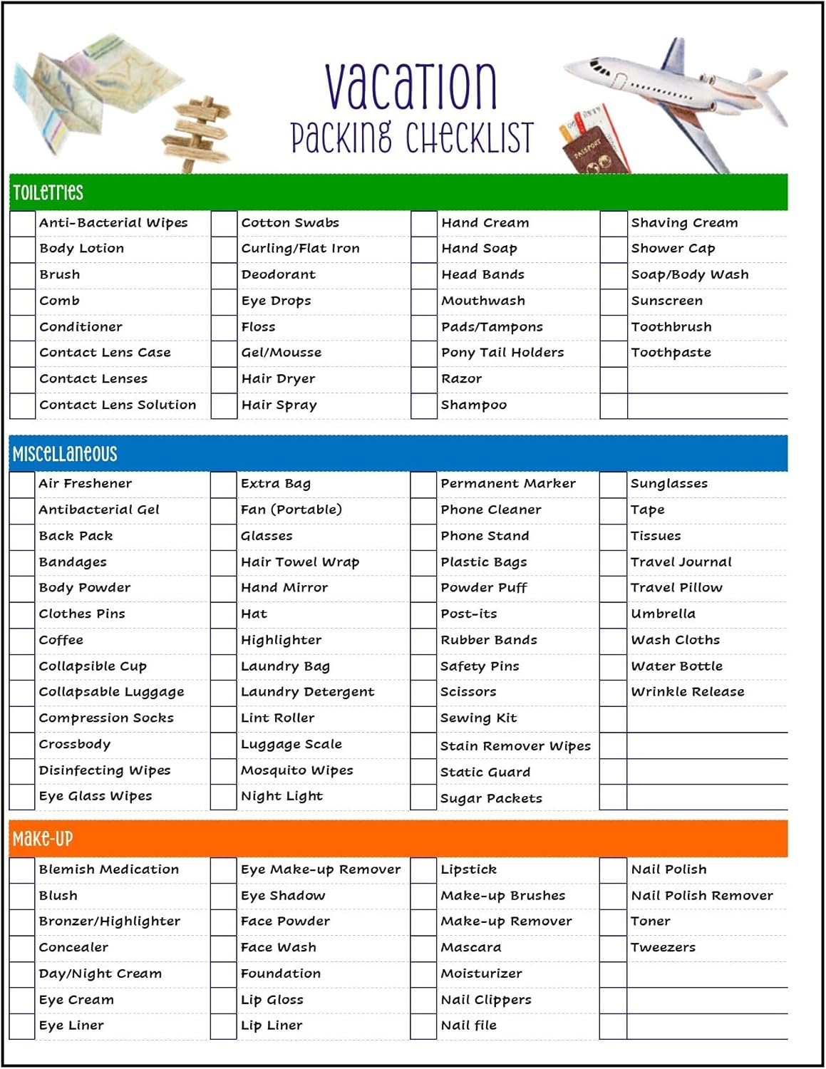 Side #1 – Toiletries, Makeup, Essentials Items Side #2 – Clothing, Essentials for Carry-on, Personal or Car, Medications/First Aid, Jewelry, Documentation