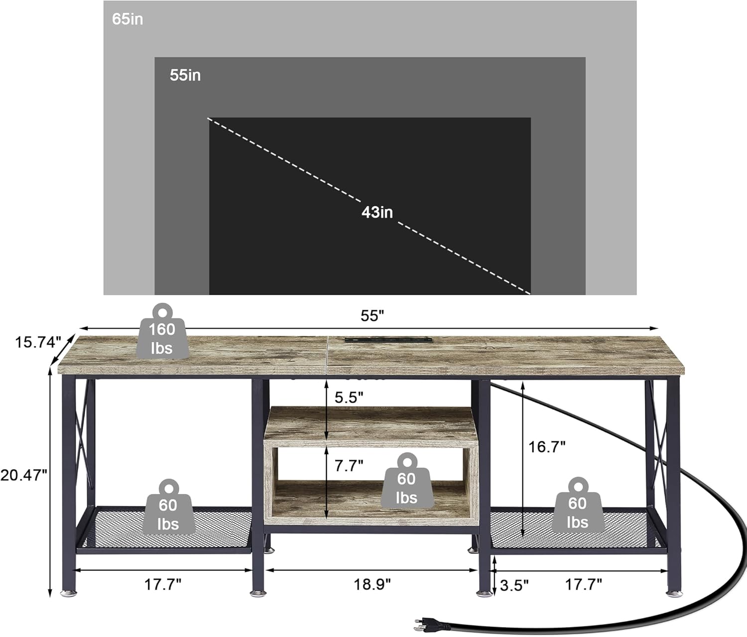 [LARGE STORAGE CAPACITY]–Overall dimensions of the TV stand is 55” Long x 15.74” Wide x 20.47” Tall. Made of high quality MDF board, which 2 side are designed with unique metal mesh shelves, not easily deformed and good for heat dissipation. The table top can hold up to 160 lbs, each mesh shelf can hold up to 60 lbs.