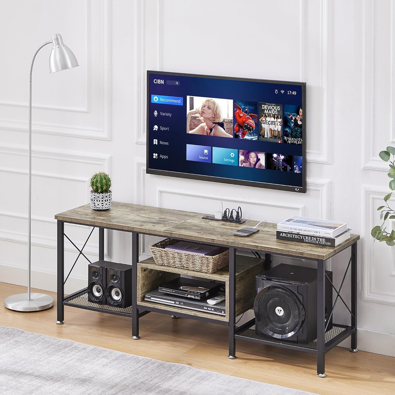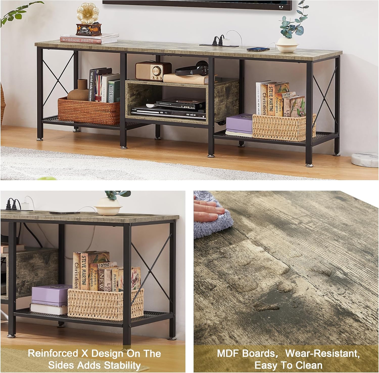 VECELO TV Stand with Power Outlets for 65 Inch Industria Media Entertainment Center with Charging Station, 3-Tier Open Shelves & Metal Frame for Living Room, Bedroom, 55 Inch, Grey