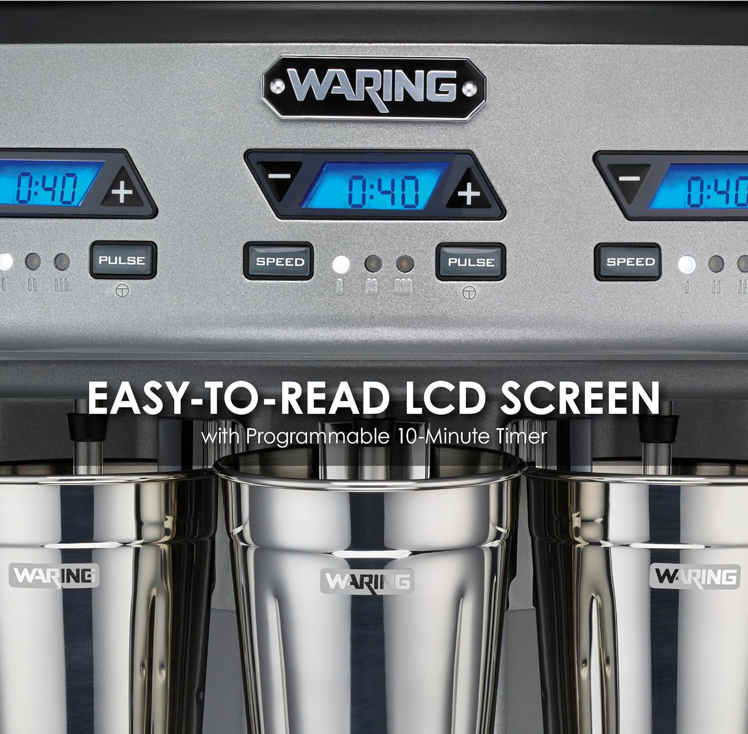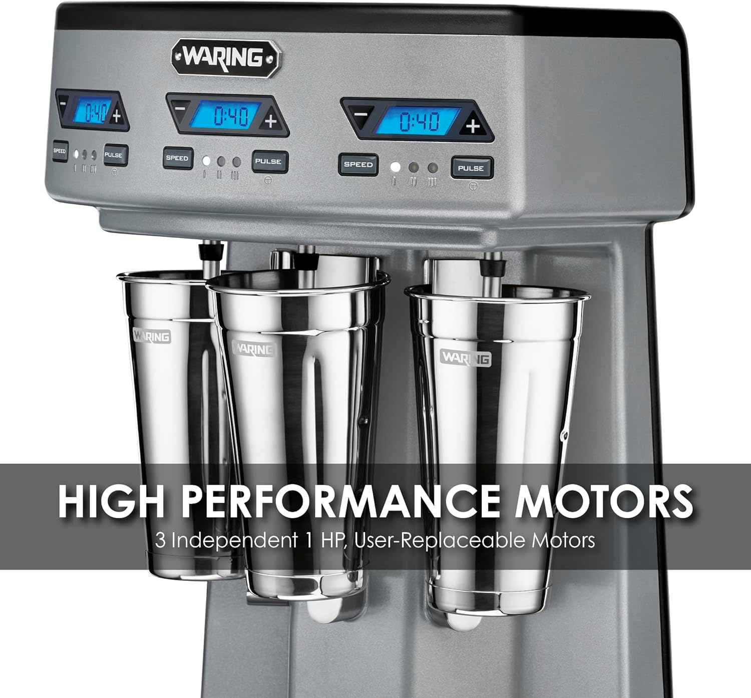 Waring Commercial WDM360TX Heavy-Duty Triple Spindle Drink Mixer, Each Spindle Has Independent 1hp Motor, with Countdown Timer, Digital Display, Automatic Start/Stop, 120V, 5-15 Phase Plug,Silver