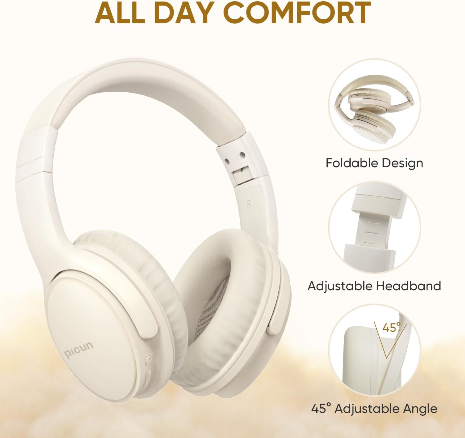 Wireless Headphones, Bluetooth Over Ear Headsets with Microphone, Hi-Fi Audio, 60H Playtime, Touch Control, Foldable Lightweight, On-Ear Headphones for Girls Women, Travel, Work, Beige