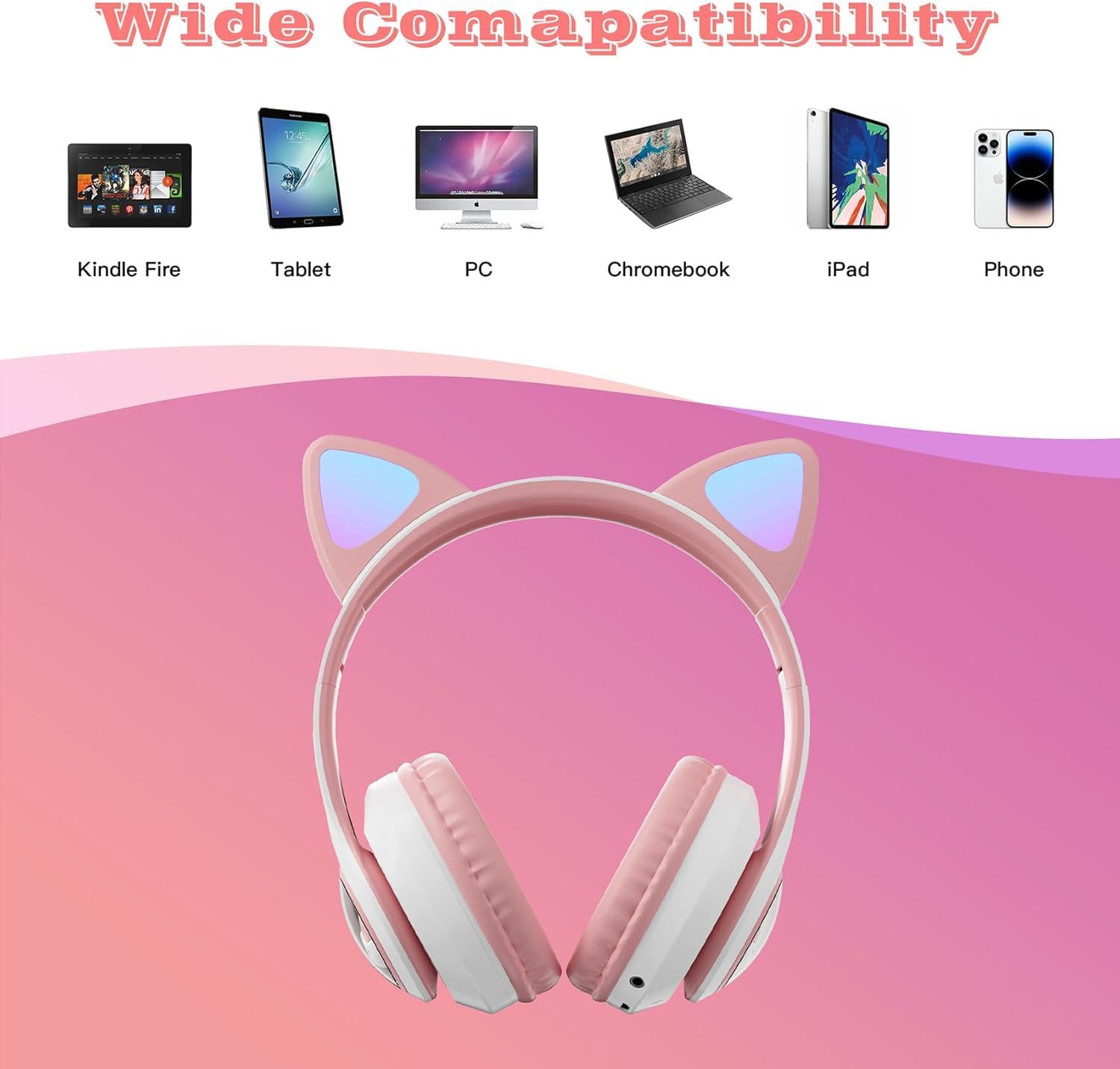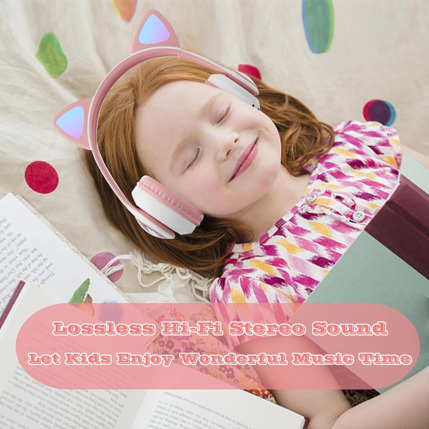 Wireless Kids Headphones,Cat Ear Headphones Over Ear for Kids Girls Teens Adults with LED Light Up, Bluetooth Wireless Headphone with Microphone for School Online Distant Learning (Pink)