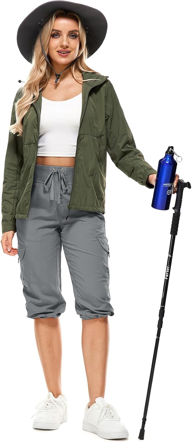Hiking Capri Cargo Pants for Women Cargo Capris Elastic Waist Drawstring Shorts Outdoor Quick Dry for Camping with Pockets