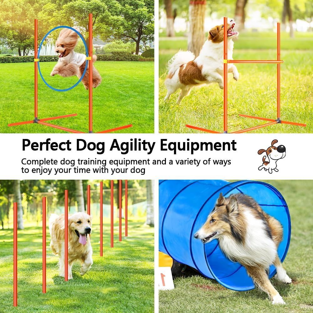 XiaZ Dog Agility Course Equipments, Obstacle Agility Training Starter Kit for Doggie, Pet Outdoor Games – Dog Tunnels, 8 Piece Weave Poles, Jumping Ring, High Jumps, Pause Box
